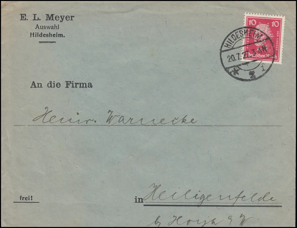 Trou de l'entreprise MA sur Friedrich le Grand 10 Pf. EF sur lettre HILDESHEIM 20.7.27
