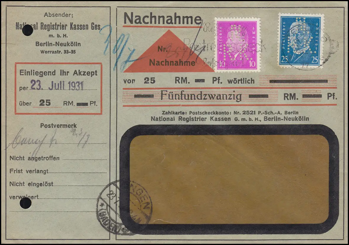 Enveloppe de courrier de réception de la société National Register Kässen GmbH à Berlin-Nukölln sur support de fenêtre de livraison à l'Engen / Baden. Avec trou de dossier selon le schéma. N° de catalogue: 416+435 Vérification: original Numéro d'article: 00000000031159>Note: Cet article n'est disponible qu'une fois. Vous recevrez exactement l ' article représenté.