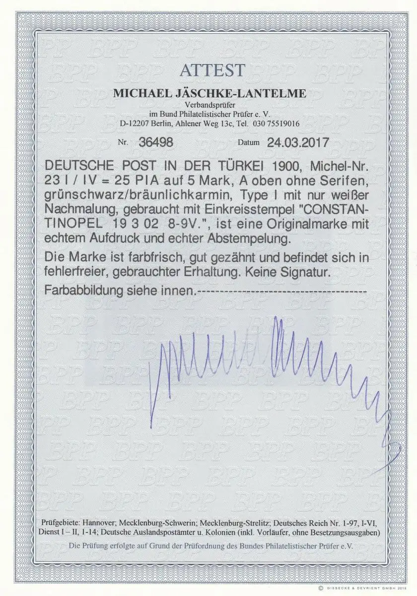 Turquie: Min. 23I / IV , cacheté, BPP Attest