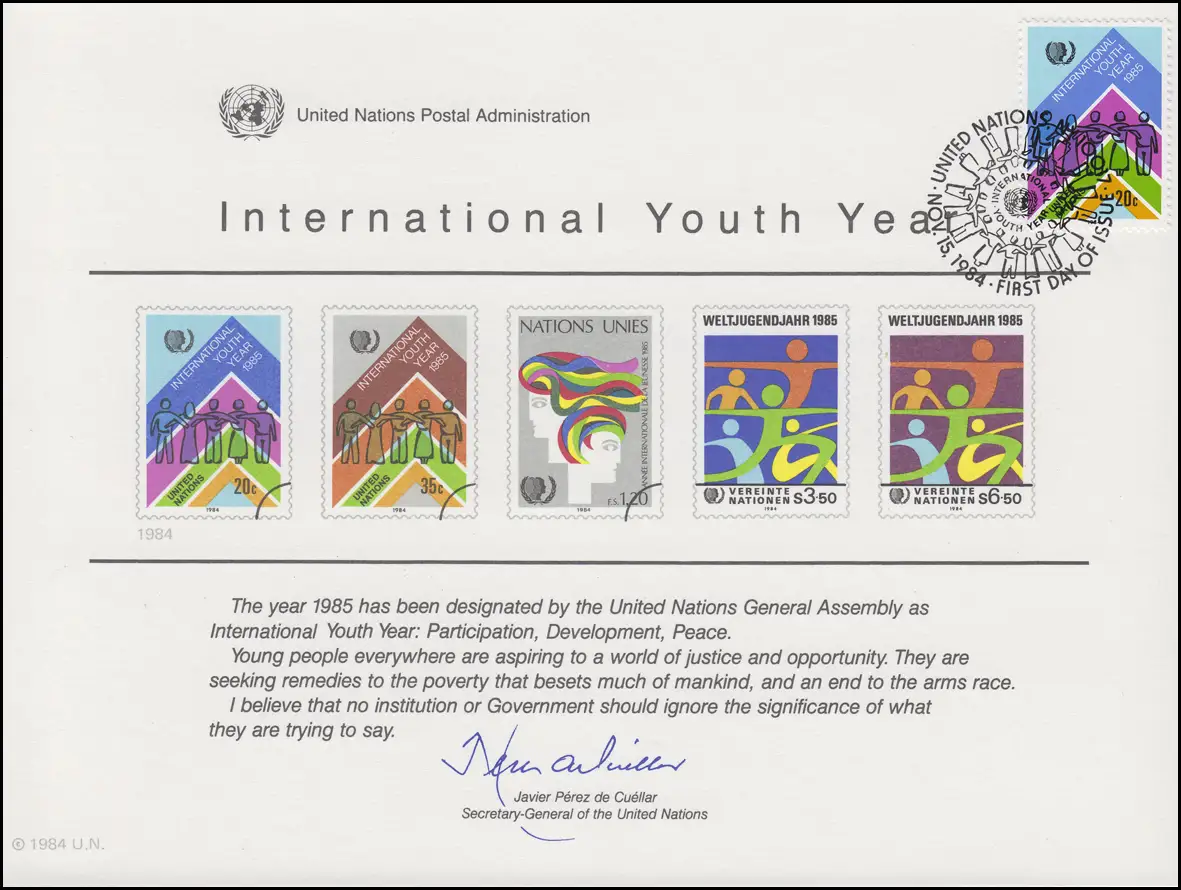 Carte commémorative de l'ONU CE 26 Année de la jeunesse 1984, NY-FDC 15.11.1984