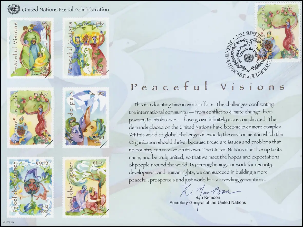 Carte commémorative de l'ONU CE 62 Visions pacifiques 2007, Genève-FDC 1.6.2007