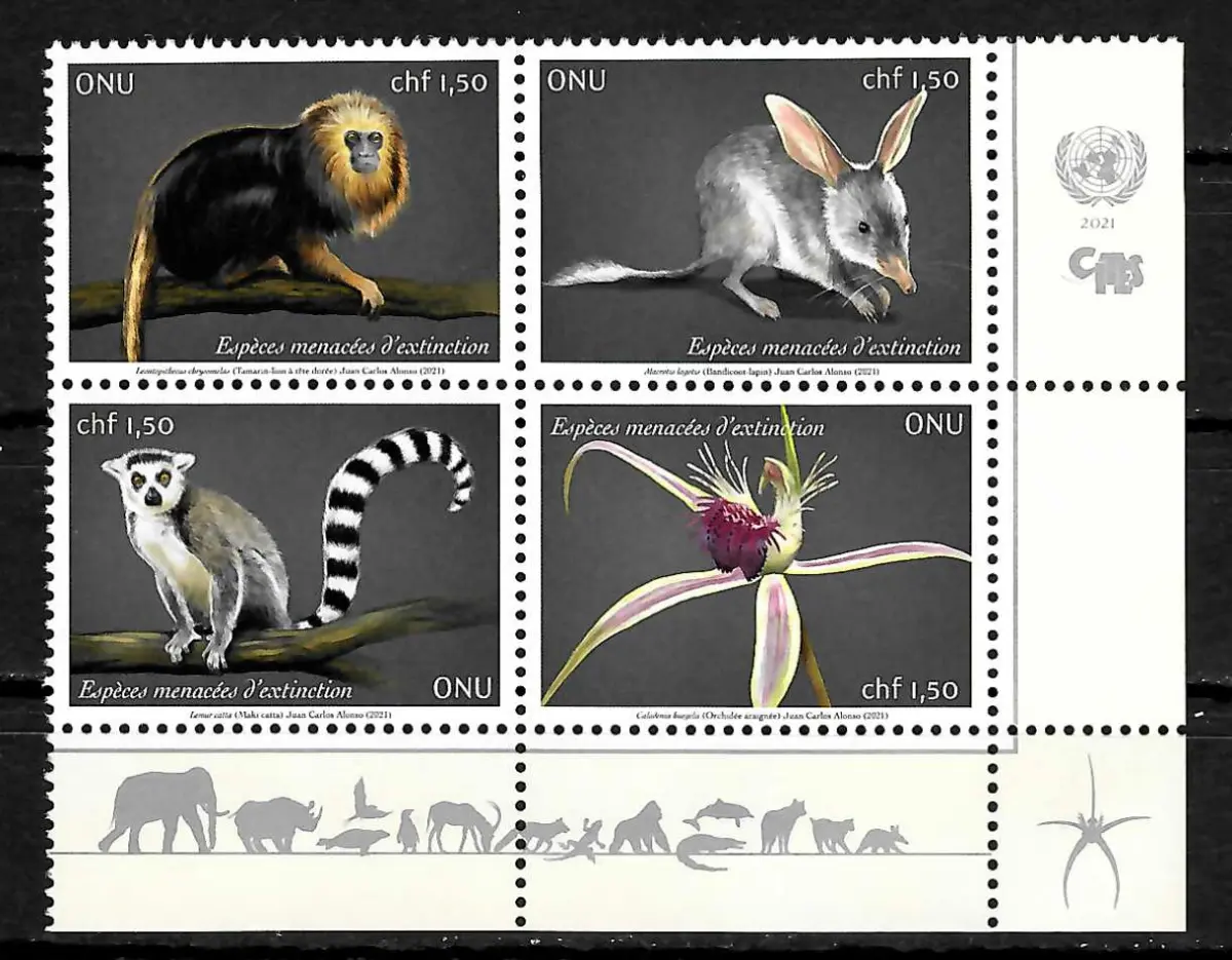 UNO Genf 2021: 4er Block Espèces menacées d' extinction, postfrisch