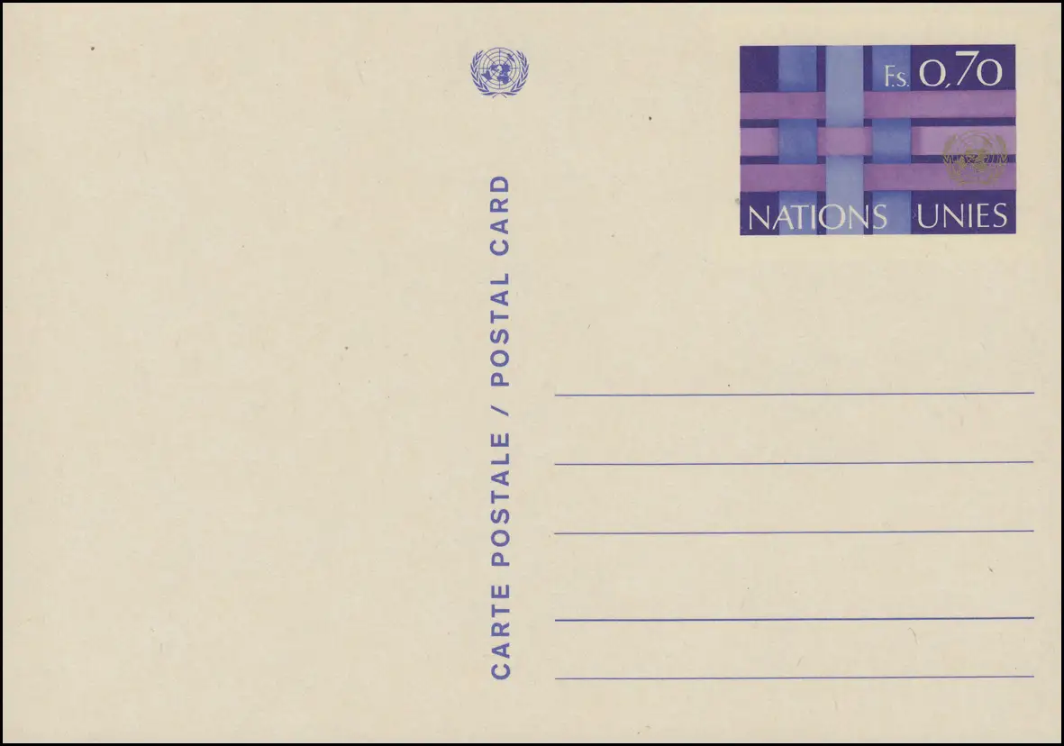 Nations unies Genève Carte postale P 4 Emblème et bandes des Nations Unies 0,70 francs 1977, inutilisé **