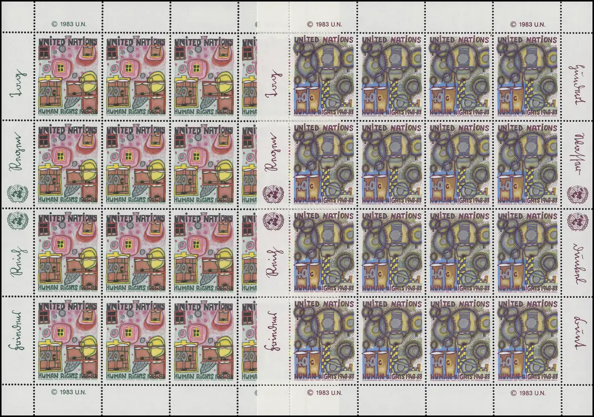 UNO New York 438-439 Droits de l'homme / Hundertwasser 1983, petit jeu de feuilles **
