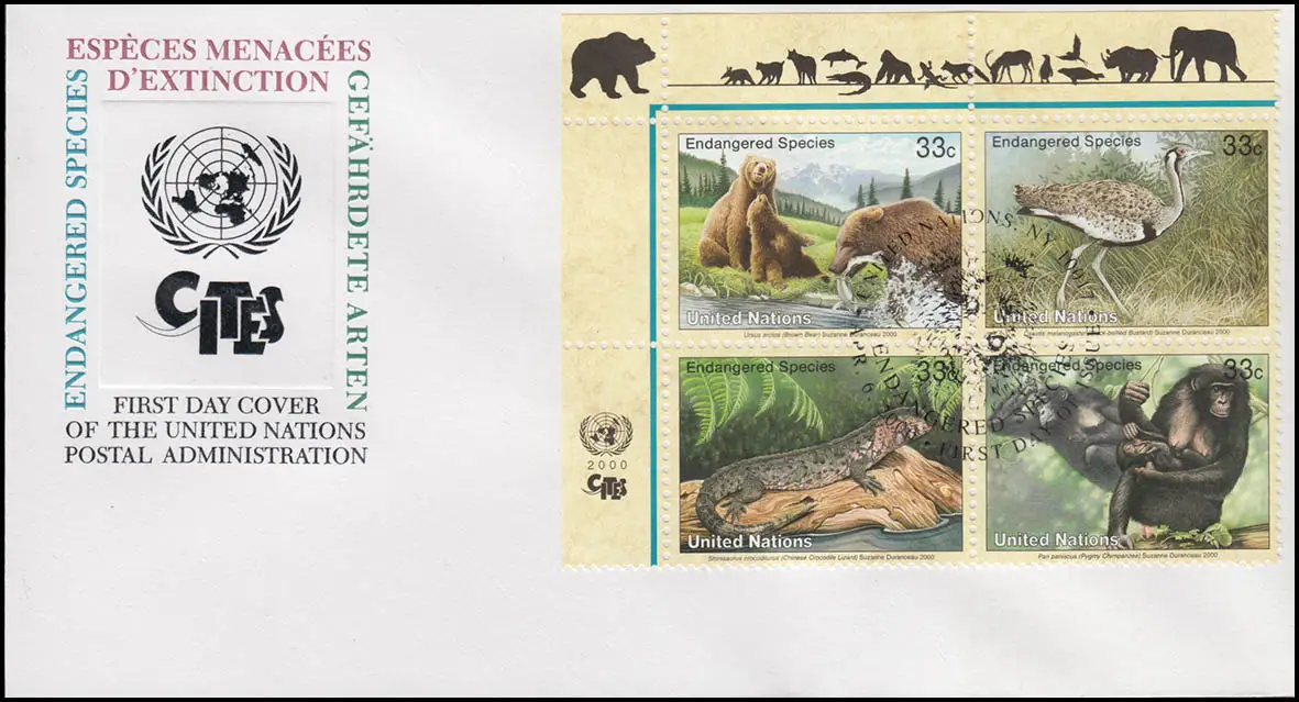 Les espèces menacées de l'ONU New York 2000 comme quatre blocs de bord sur les bijoux FDC
