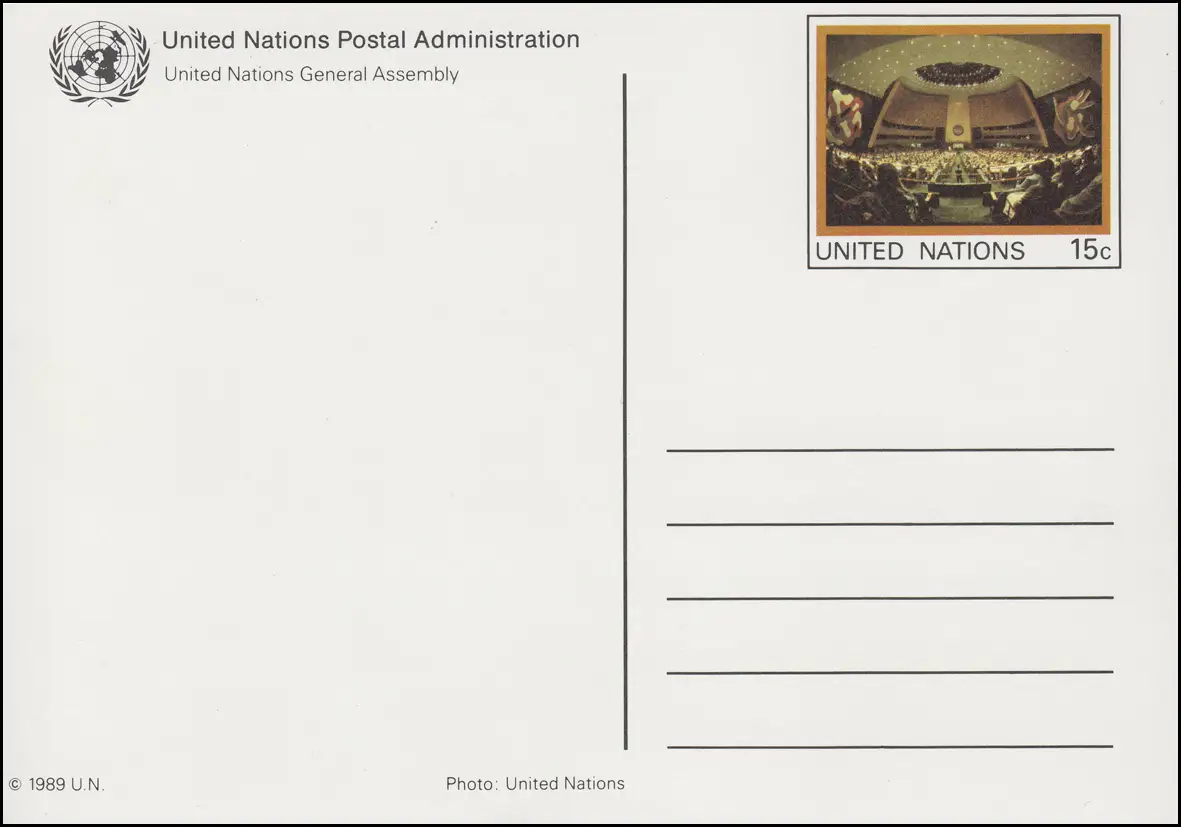 Carte postale des Nations Unies P 13 Assemblée générale 15 centimes 1989, inutilisé **