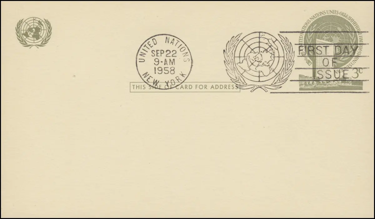 Carte postale des Nations unies P 2 quartier général des NU 3 cent olive 1958, FDC 22.9.1958