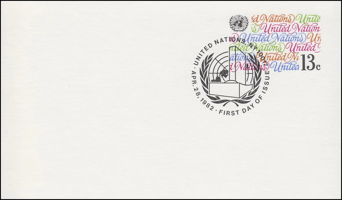 Carte postale des Nations Unies, New York, P 8 Inscription United Nations 13 cent 1982, FDC 28.4.1982