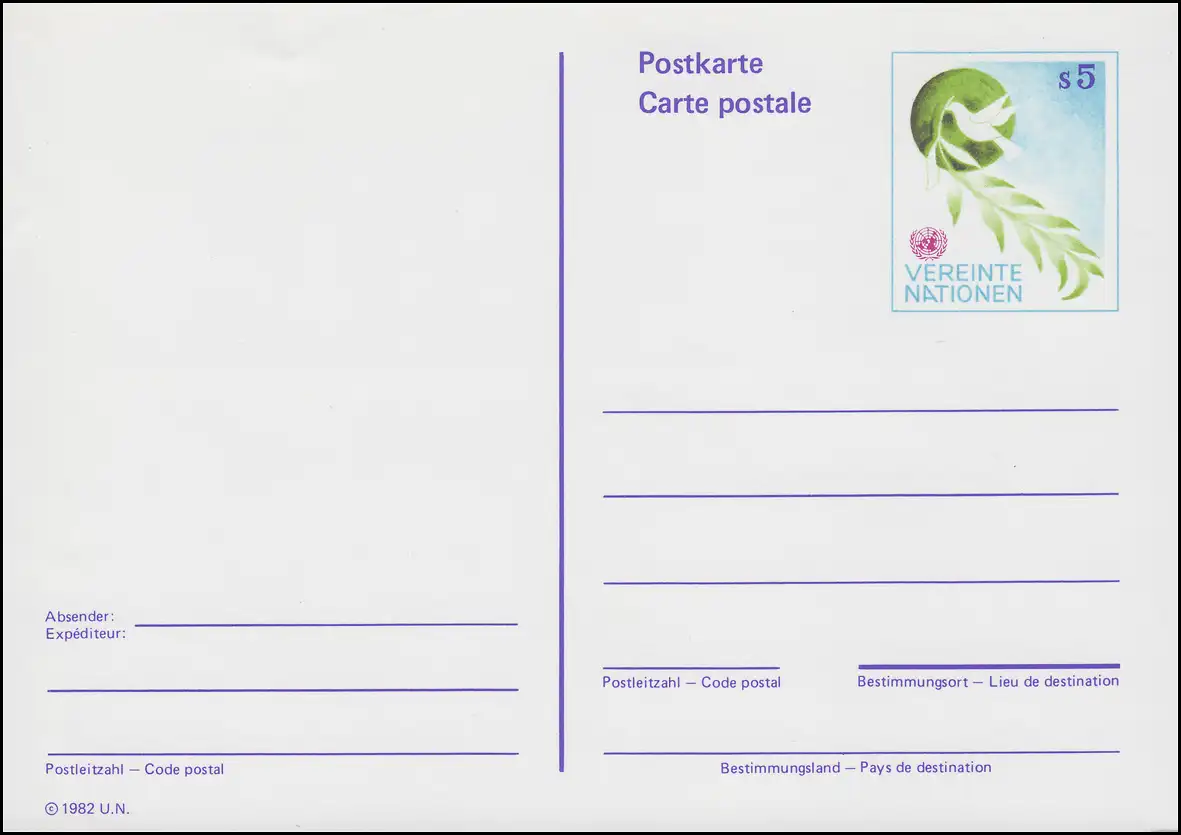 Nations unies Vienne Carte postale P 2 Pigeon avec branche d'olive 5 Schilling 1982, inutilisé **
