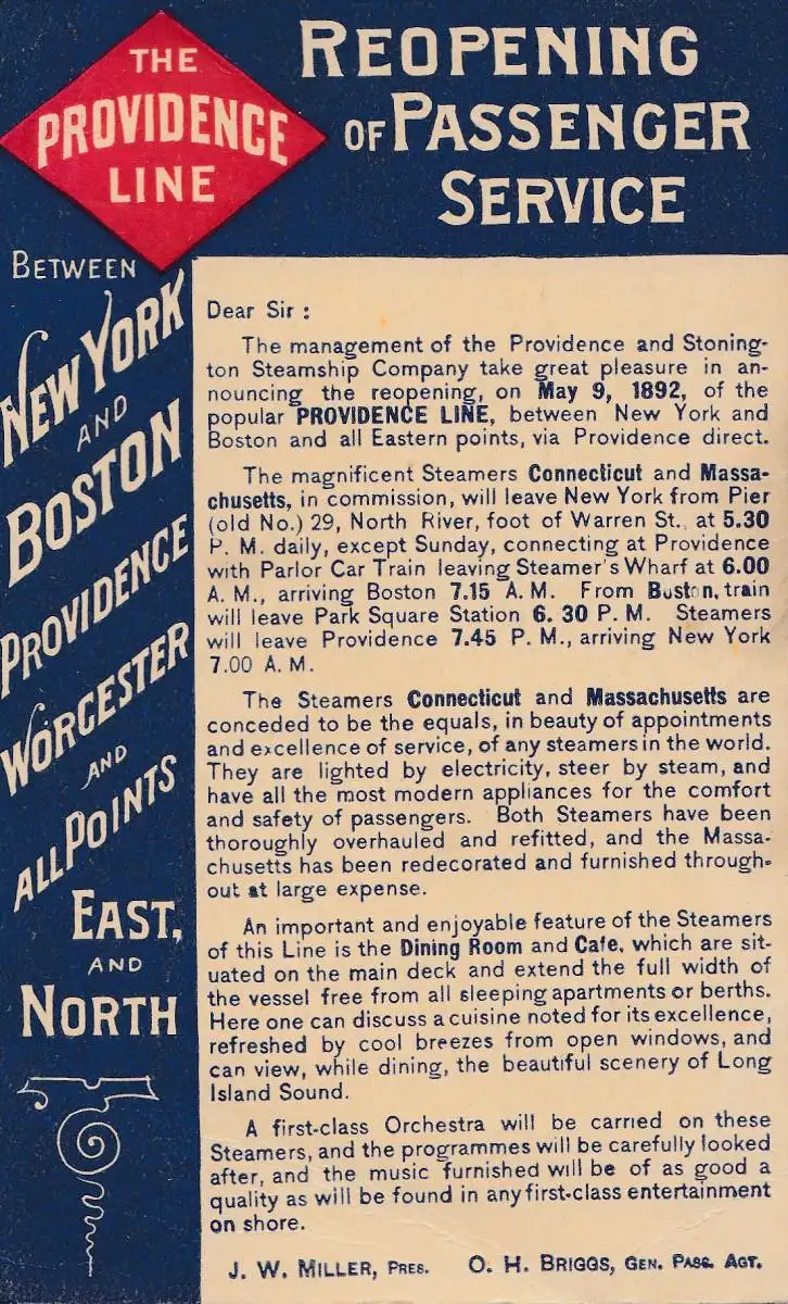 USA 1892: post card New York: Reopening of passger Service: Providence line