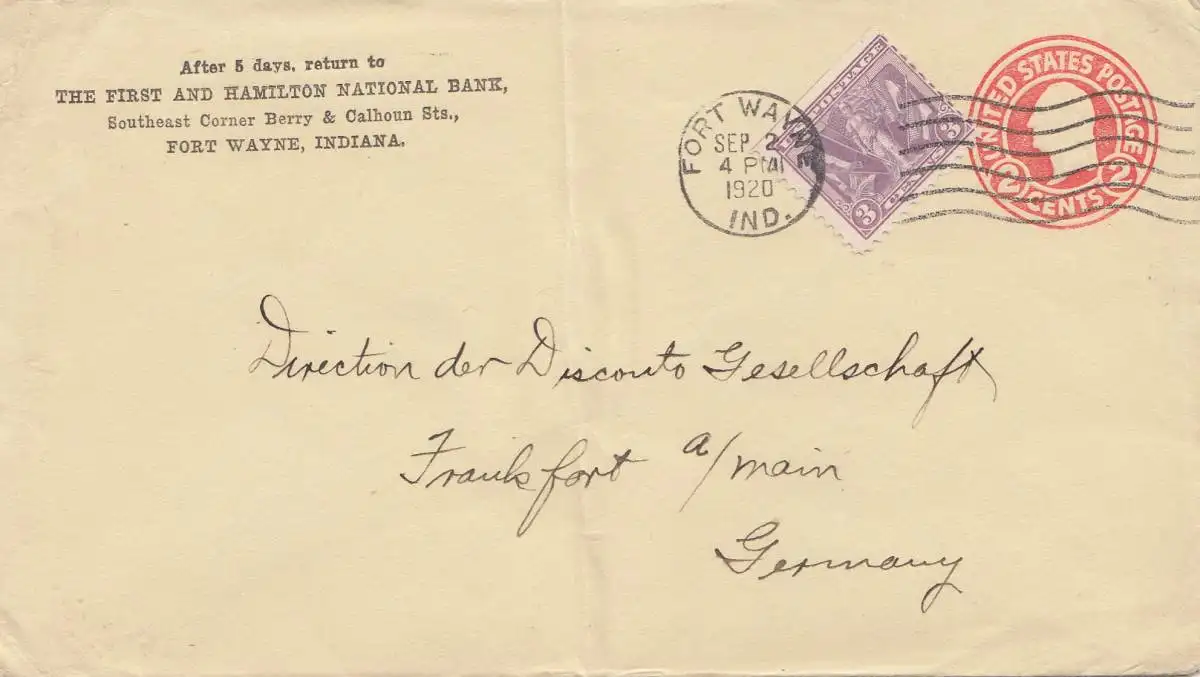 États-Unis d'Amérique 1920: Hamilton National Bank, Fort Wayne, Indiana to Frankfurt/Germany