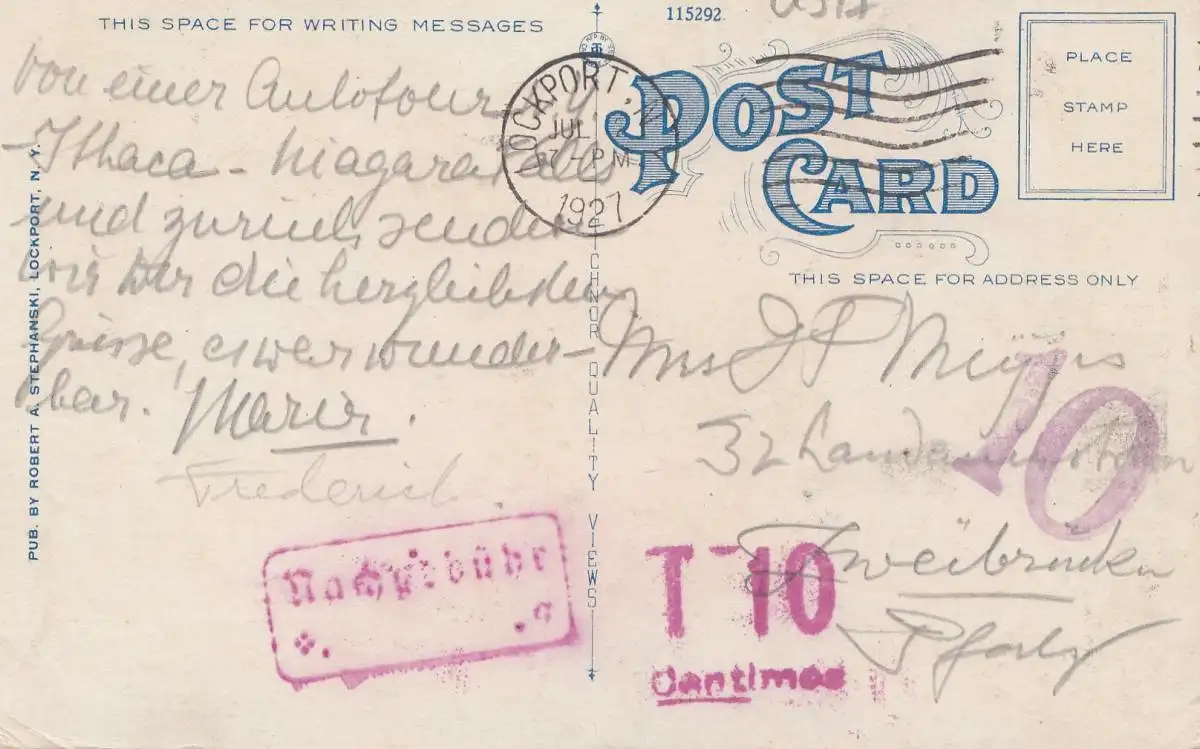 États-Unis 1927: Lockport, NY, post card to Zweibrücken/Germany