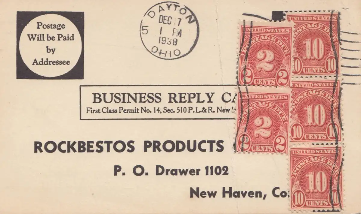 USA 1938: post card Daytton, Ohio to New Haven, Con. Business reply cart
