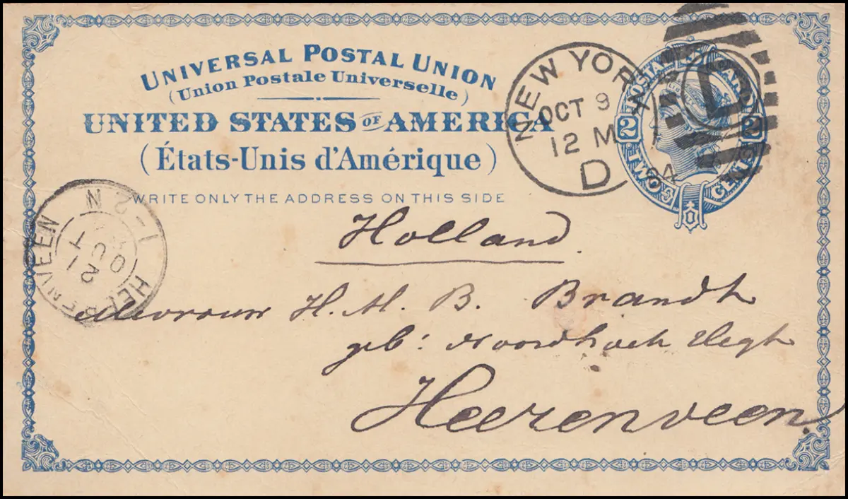 USA Carte postale 2 Cent Liberty bleu NEW YORK 9.10.1884 vers HEERENVEEN 21.10.84