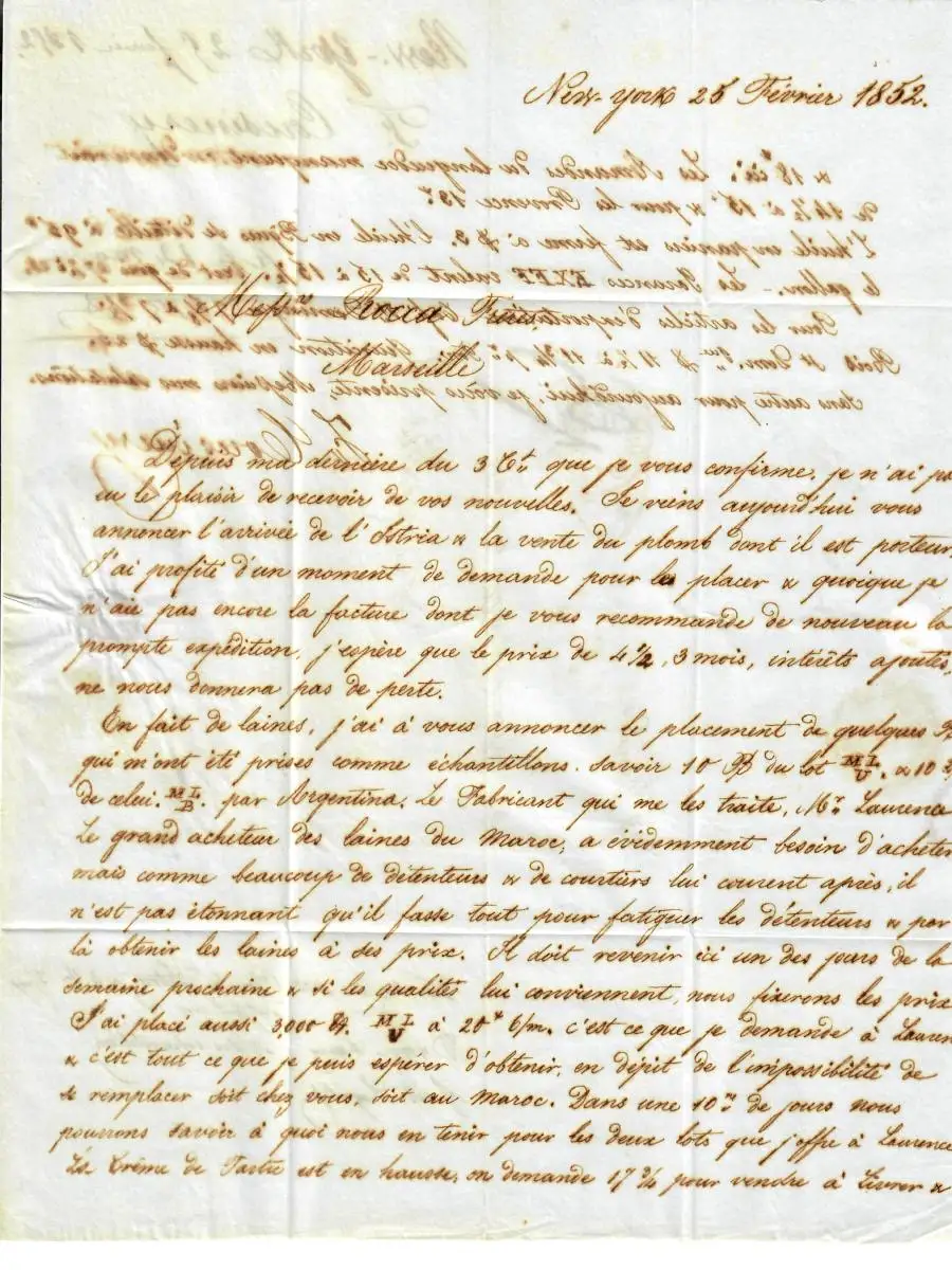 USA to France: 1852: Transatlantic Post: P. Canada to Marseille