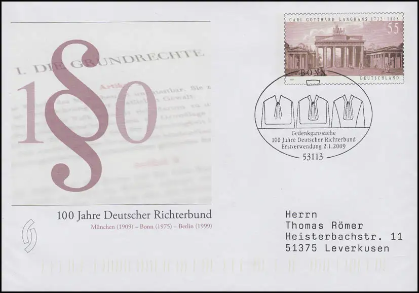 USo 174 Fédération allemande des juges, FDC Première utilisation Bonn Richterroben 2.1.2009
