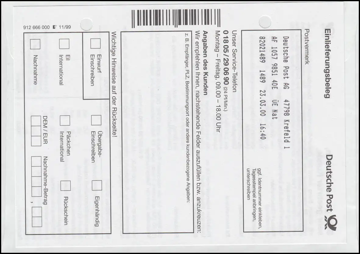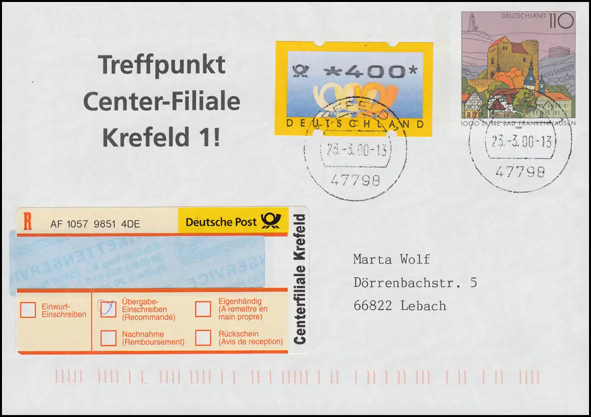 Lettre spéciale plus Ouverture "Filiale Centre de rencontre" le 23.3.2000 à Krefeld, édition complète environ 1000 pièces, billet spécial R approprié, permis de livraison, adapté au port avec ATM 400 Pfennig vers Lebach, numéro de catalogue codé: USo5BIIIY Vérification: original Numéro d'article: 00000000014971>Remarque: Cet article n'est disponible qu'une seule fois. Vous recevrez exactement l'élément représenté.