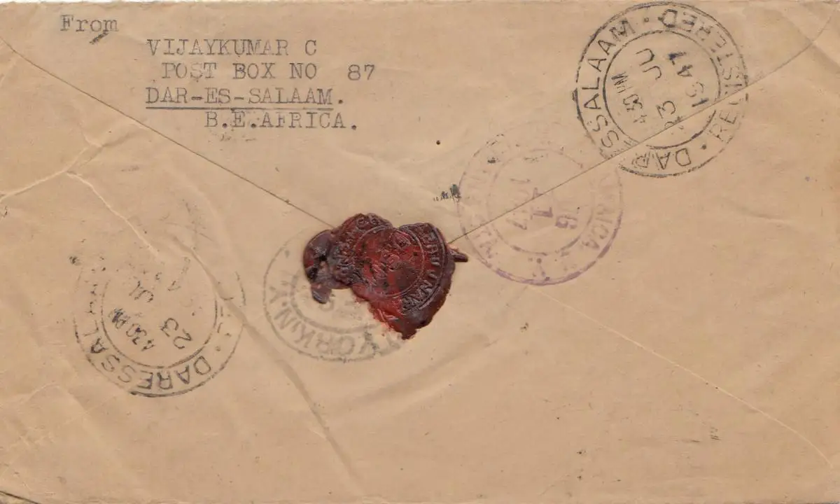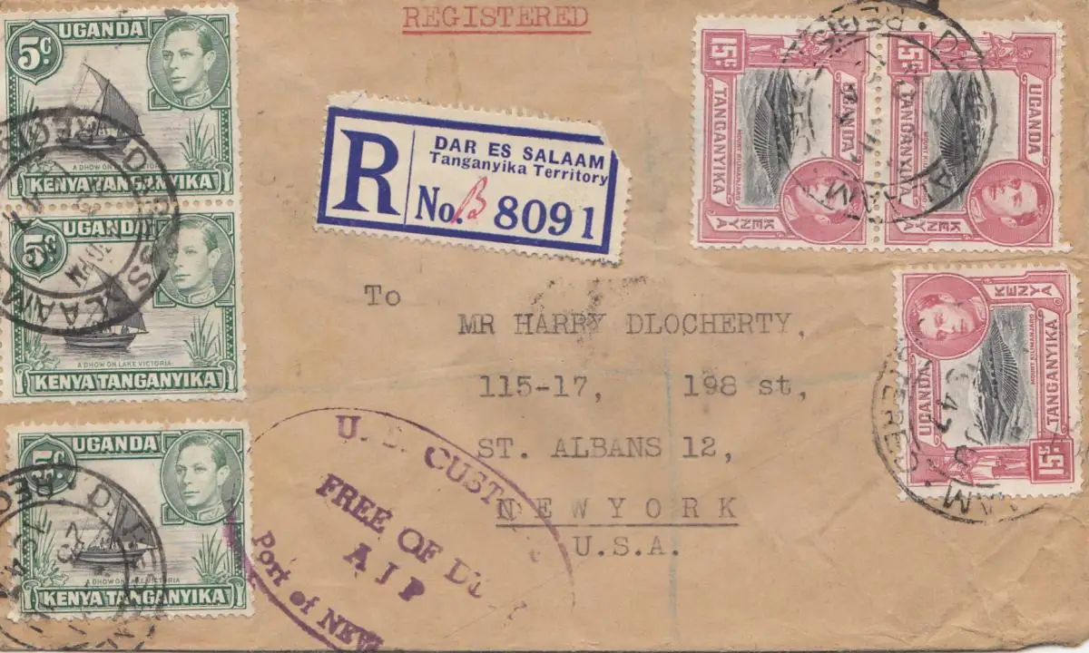 Ouganda: 1947: Redrigerted Dar Es Salaam to New York - Free of Duty