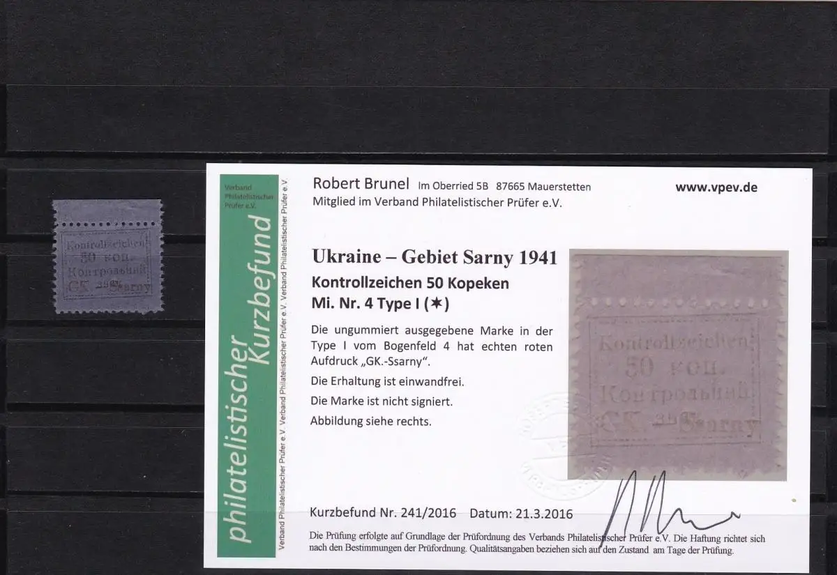 Ukraine 1941, région de Sarny: MiNr. 4 Type I, *, non élastique
