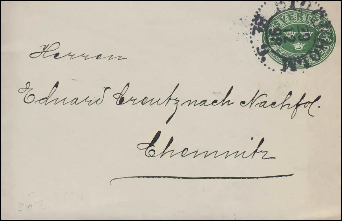 Enveloppe 7 Trois couronnes 5 Öre, STOCKHOLM 29.12.1898 vers Chemnitz