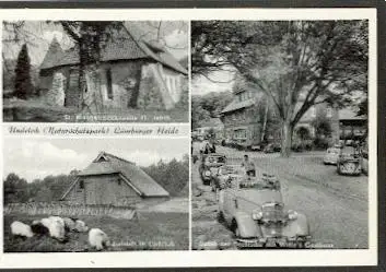 Undeloh Naturschutzpark, Lüneburger Heide. St. Magdalenenkapelle 11 Jh. Schaafstall in Undeloh. Unter der Dorfheide mit Witte´s Gasthaus. - Gelaufen 1957.. (NPLZ 21274).
