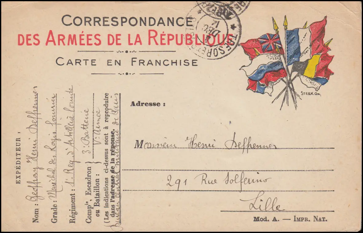 Unité d'artillerie française TRESOR ET POSTE 4.12.1914 à Lille