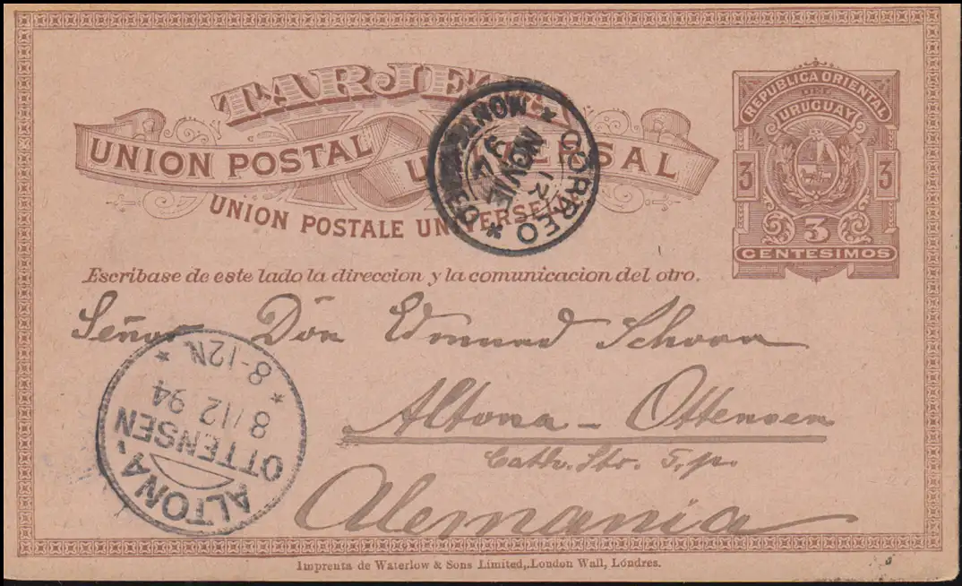 Carte postale 3 cent. brun MONTEVIDEO 13.11.94 après ALTONA OTTENNEN 8.12.94