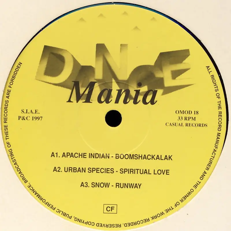 12" Maxi Various - Dance Mania OMOD 18, couverture neutre, disque d'état VG+; Fabriqué en Italie 1997 Casual Records OMAD 18, Traces Apache Indian - Boom Shack-A-Lak, Urban Species - Spiritual Love, Snow - Runway, CJ Lewis - Sweets For My Sweet, Ice-T - Colours