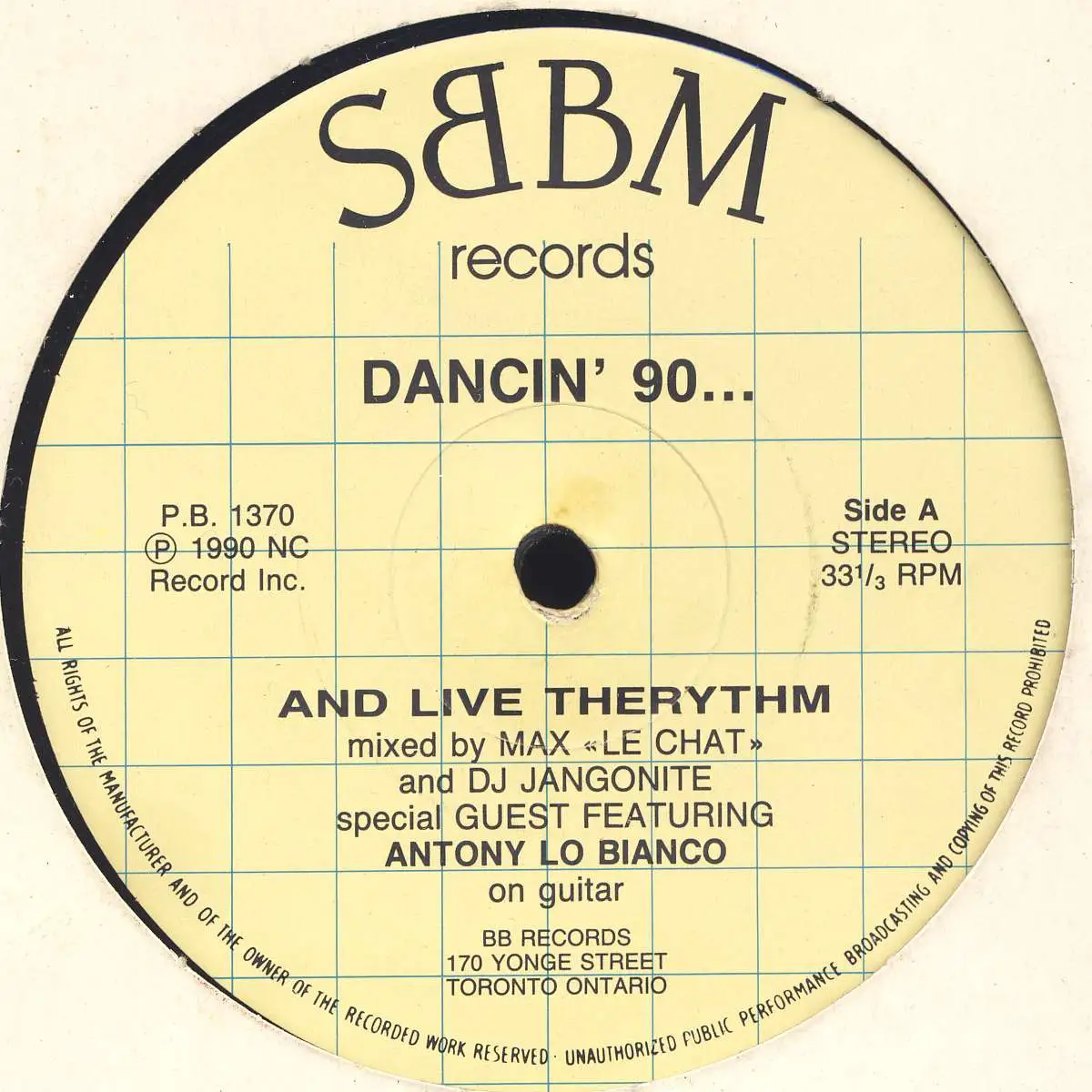 12" Maxi Various Artists - Dancin' 90... And Live Therythme, couverture neutre, état plaque G+; Fabriqué dans Canada 1990 SBBM Records P.B. 1370