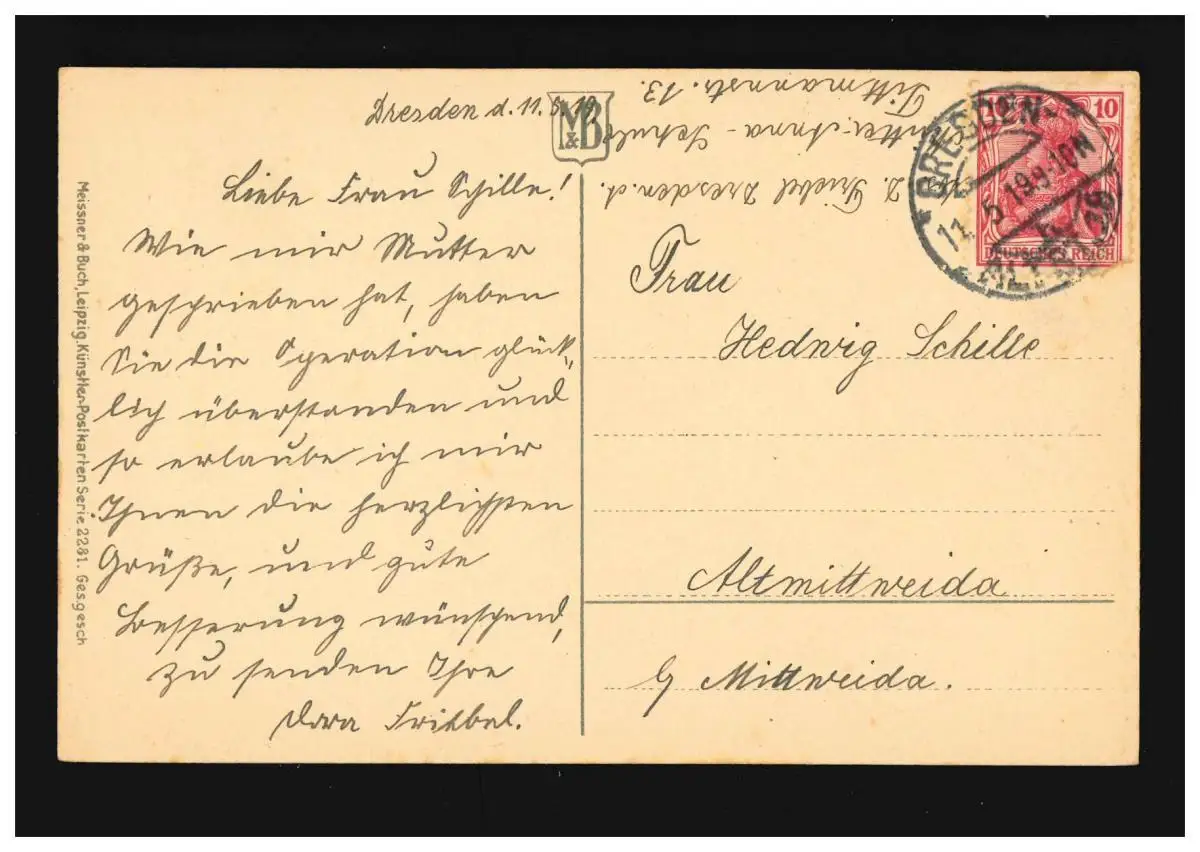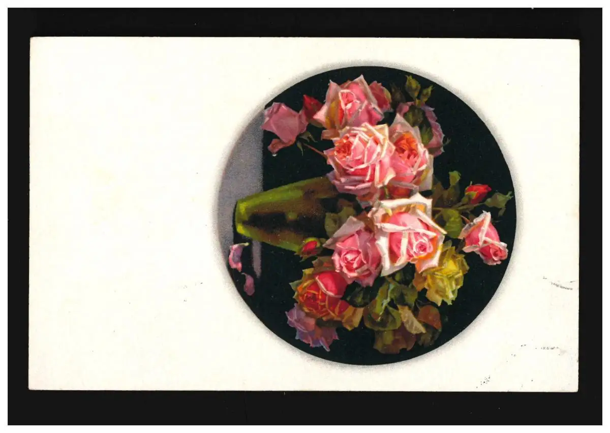 Vase de fleurs AK avec roses roses jaunes Ronde Passepartout, Dresde 11.5.19