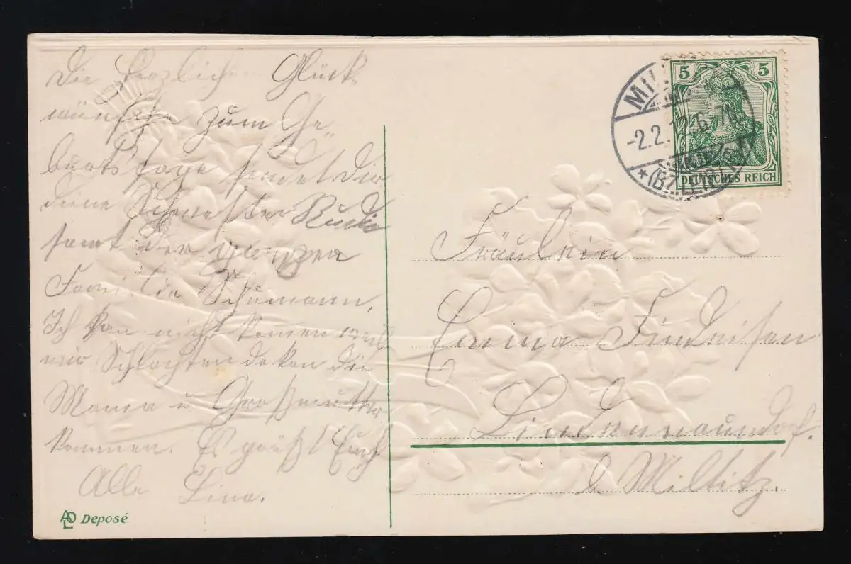 Vase fleuri de violette, Félicitations Miltiz 2.2.1912