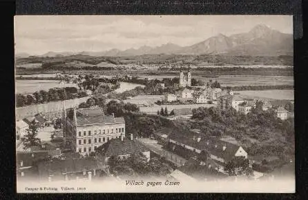 Villach gegen Osten - Rückseite mit Text.Caspar u. Poltnik, Villach 1908 .(Österreich PLZ 9500)
