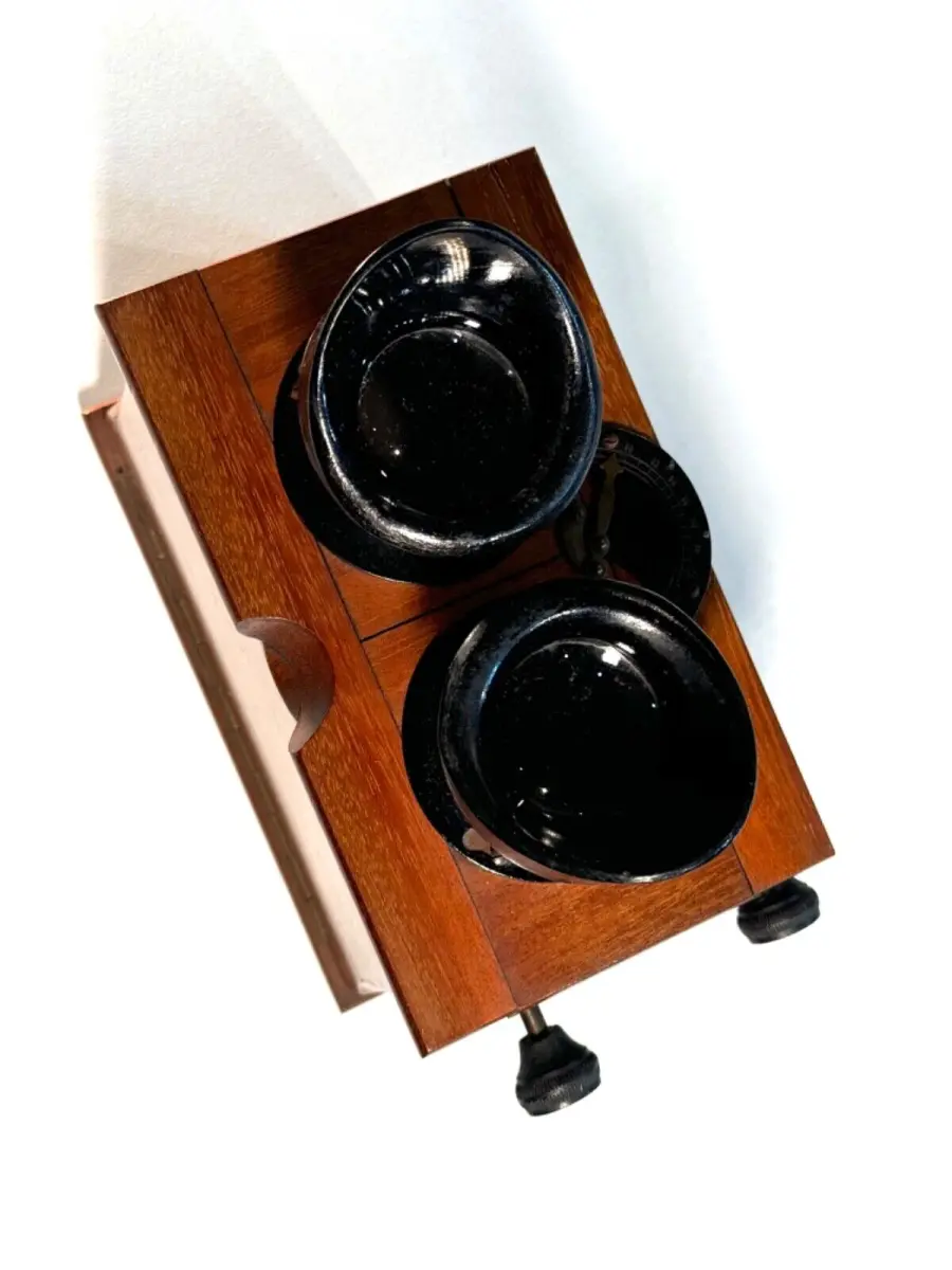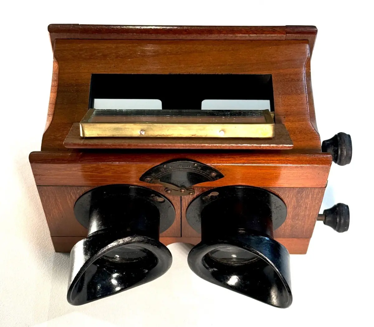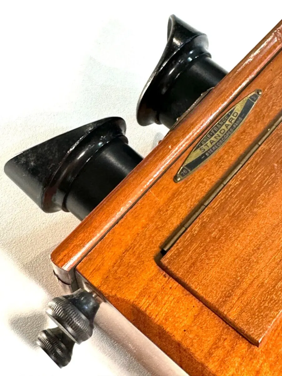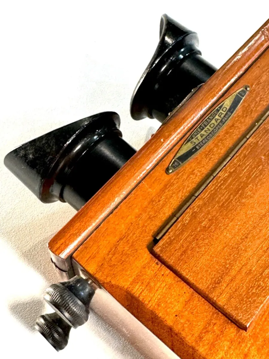 Très belle visionneuse stéréoscopique en acajou Unis-France pour vues 45 x 107mm avec rare règlage de l'écartement des yeux et mise au point par molette.
