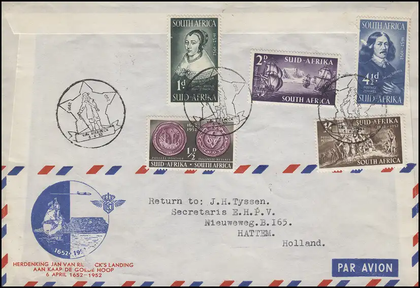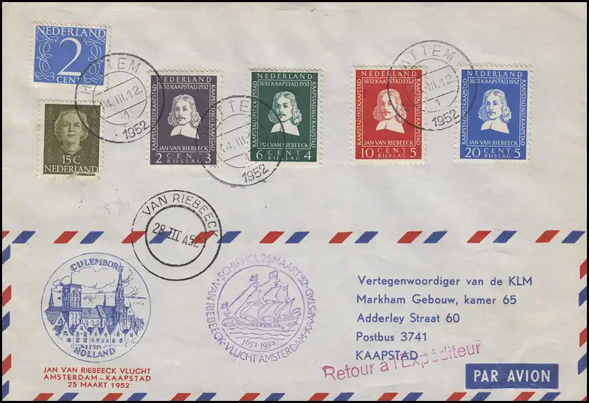 Vol spécial Amsterdam-Kaapstad KLM Jan van Riebeeck 25.3.52 et suite SSt 6.4.52