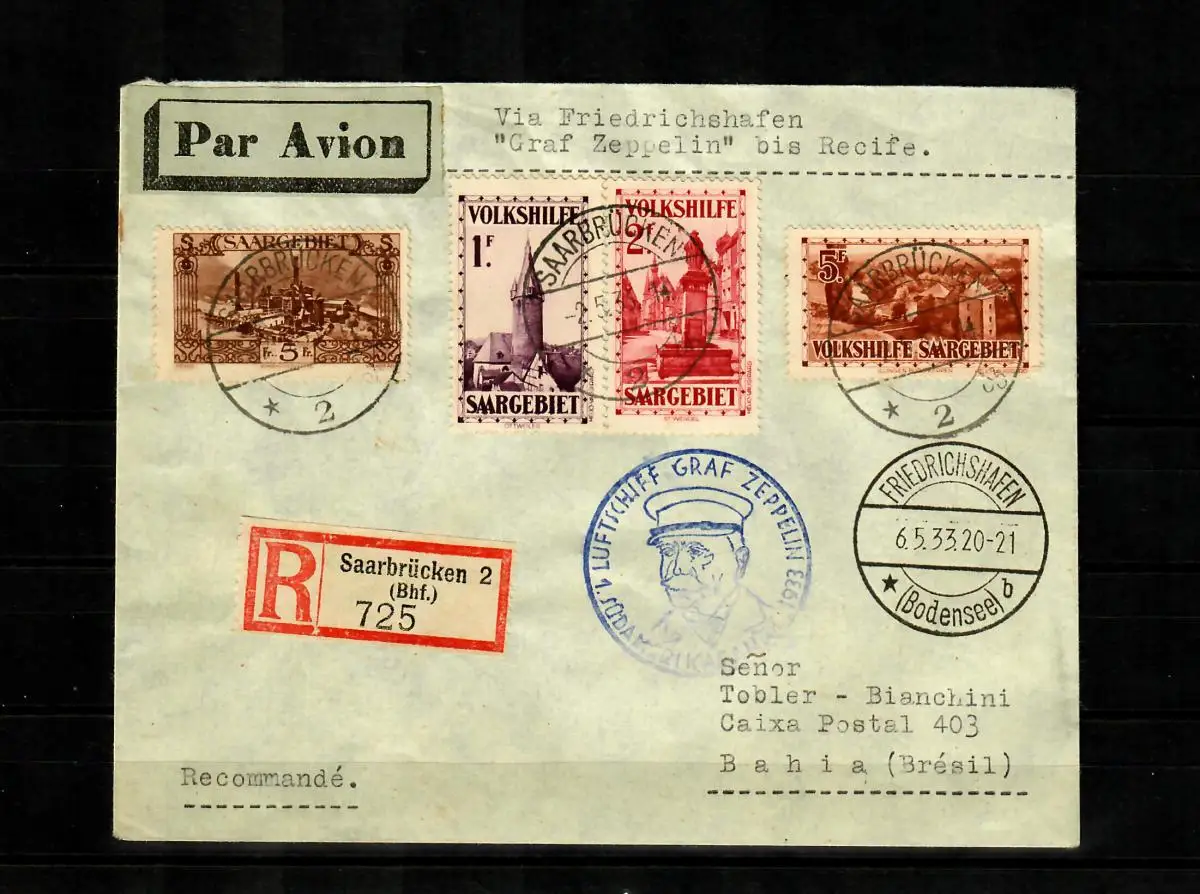 Volkshelp Saar, 3x recommandé Sarrebruck, comte Zeppelin jusqu'à Recif jusqu 'au Bahia