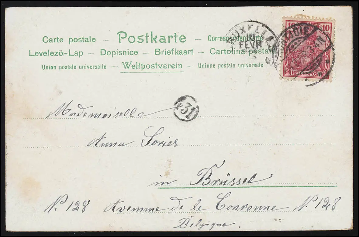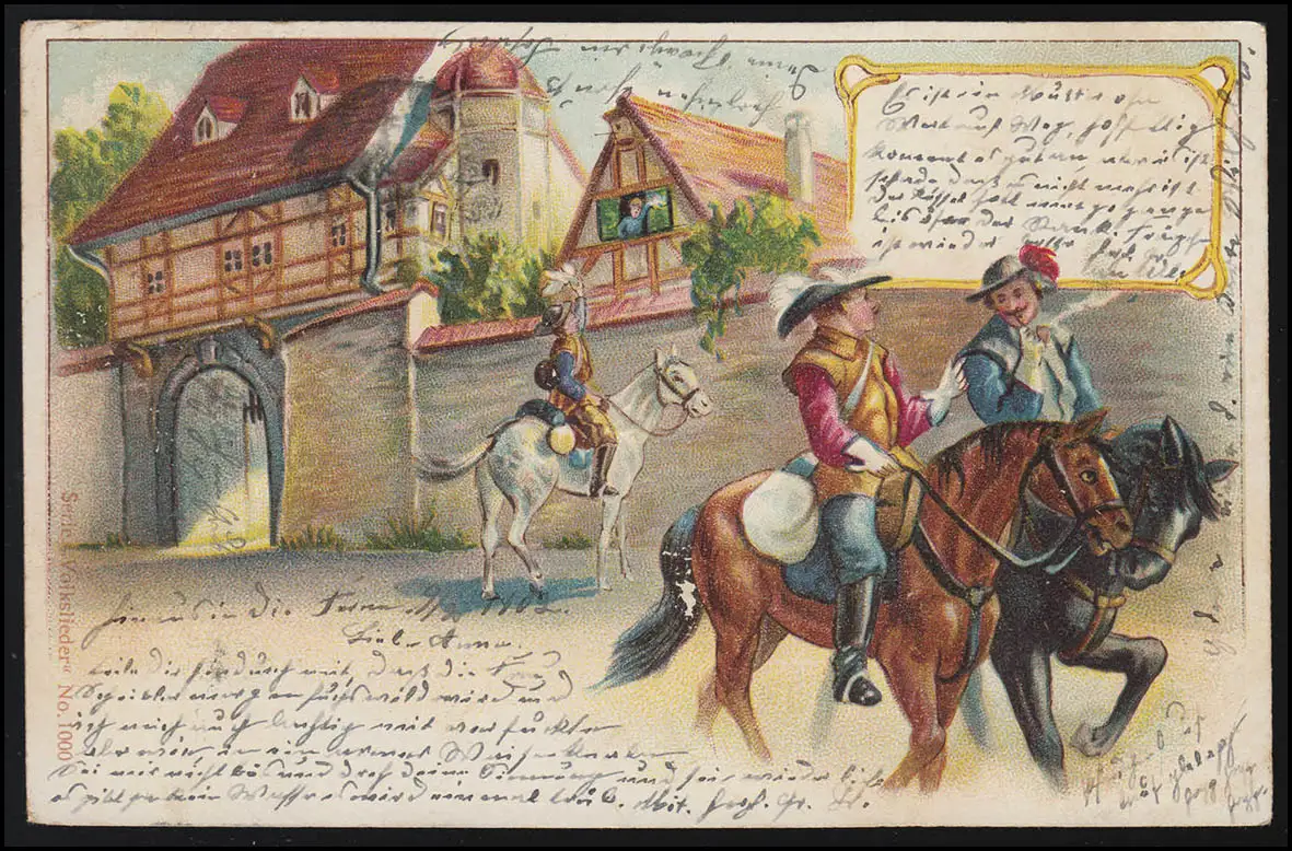 Volkslieder-AK Au revoir porte de ville Reiter, MONTJOIE 9.2.1902 après BRUXELLES 10.2.2.02
