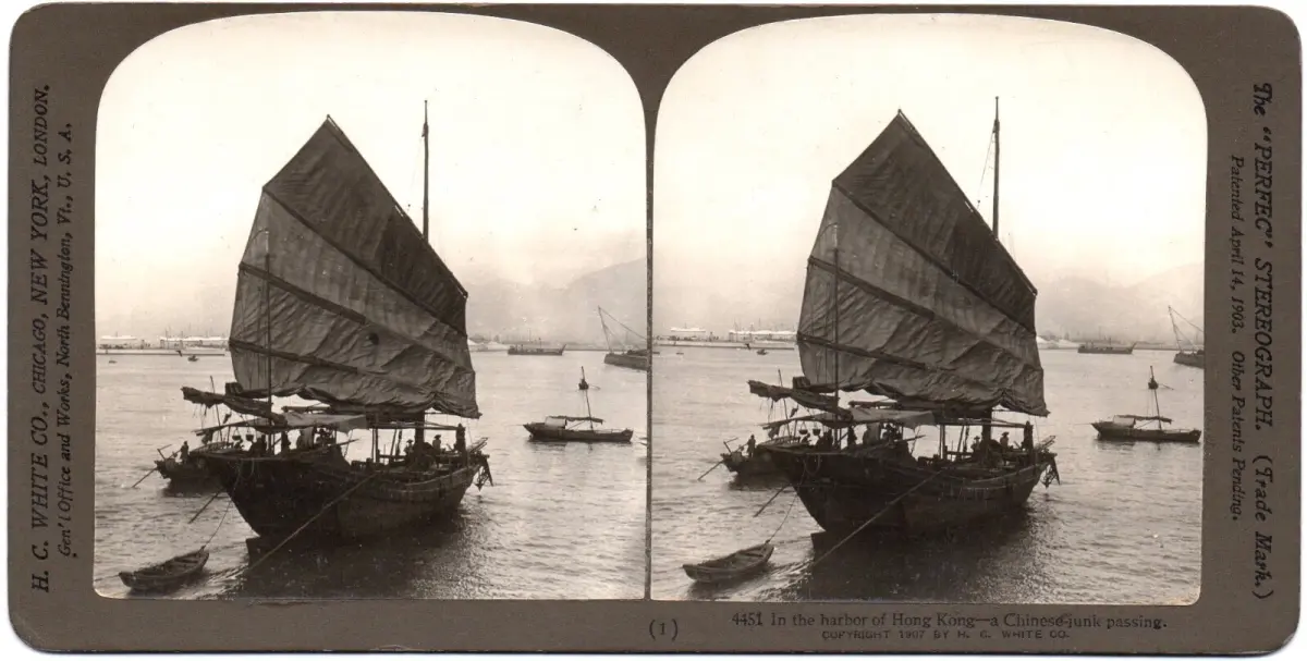 Dans le port de Hong-Kong une jonque chinoise passe
