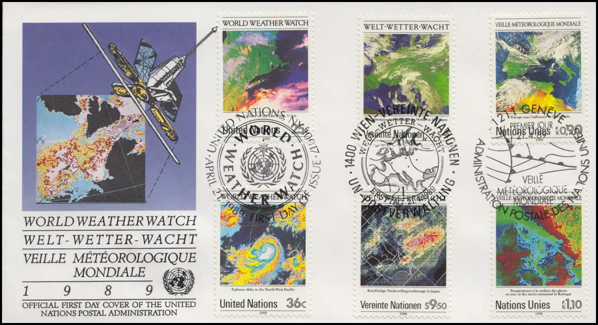 WMO Météorologie Veille du pari mondial - FDC de bijoux des 3 numéros de l'ONU 1989