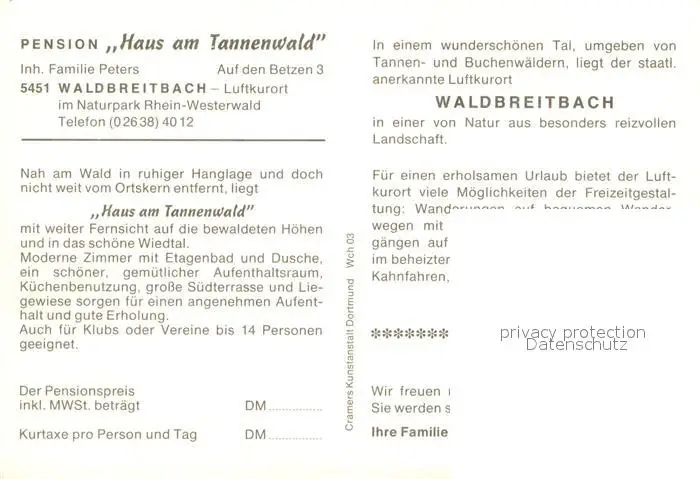 Waldbreitbach_Wied Panorama Haus am Tannenwald Terrasse Gaststube Waldbreitbach Wied postalisch nicht gelaufen nach 1965 Werbekarte (keine Postkarte) Erhaltung siehe scans [WerneD78] Werbekarte (keine Postkarte) WernPID7