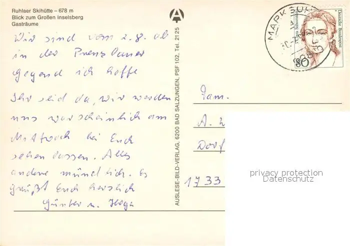 Waltershausen_Gotha Ruhlaer Skihuette im Thueringer Wald Grosser Inselsberg Waltershausen Gotha postalisch gelaufen 1993 Erhaltung siehe scans [FriedD77] Frierer