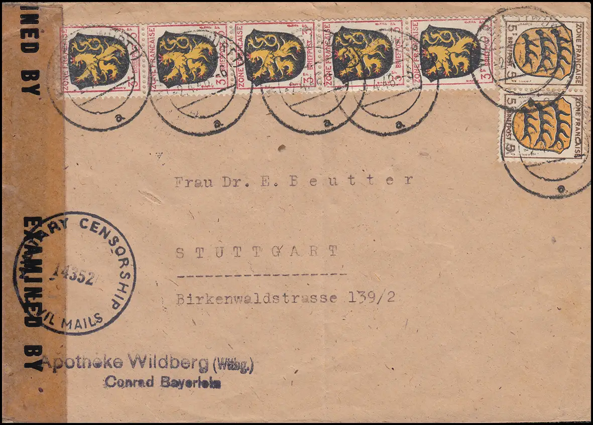 Blattes 3+5 Pf Lettre de censure CENSORSHIP 14352, WÜRTTEMBERG 2.4.46 n. Stuttgart