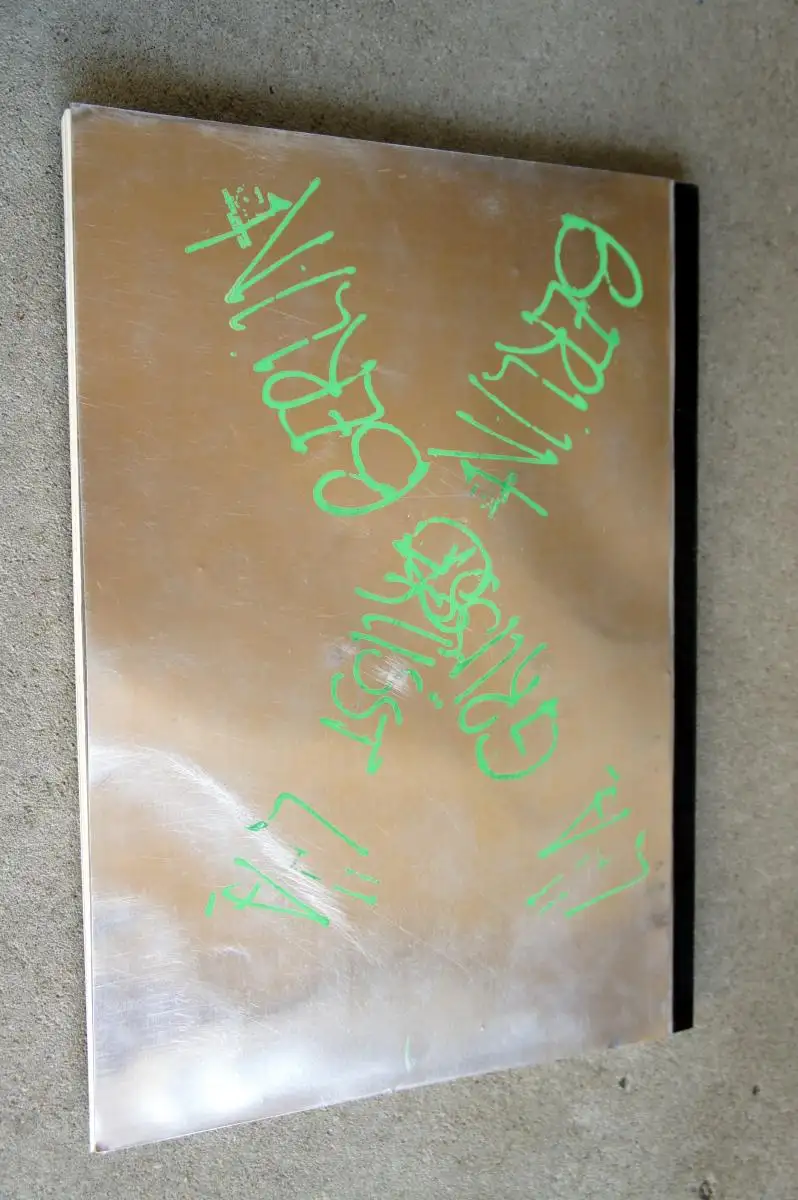 Warnke Uwe, Berlin, juillet 1993. 58 feuilles et suppléments. Claviers en carton - Sérigraphies sur plaque d'aluminium de Thomas Günther. Revue originale en 30 exemplaires avec des contributions de: surpeuplement de 4 reproductions photographiques de Helmut Löhr, papier travaillé par John Gerard, sérigraphe et texte de Sabine Jahn, 3 dessins de Ottfried Zielke, 4 dessins sur des copies de Lilo Karsten, 2 collages, quatre copies et textes de Luitz Wülrab, 7 textes et 3 pièces trouvés par Uve Warnke et 4 textes par Nils Lohmann, graphique de Guillermo Deisler, trois textes du Stefan Buchenau,3 photos de Kopien, deux sur peints) de Birger Jesch, 8 dessins par Stefann Raum, huit cartes postales dès Jürgen Olbrich, et dessin de Hartmut Andrycz, dessin par D.