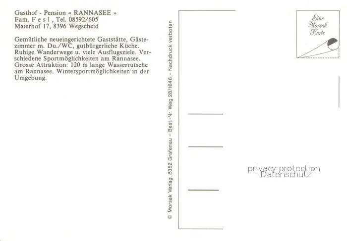 Wegscheid_Niederbayern Gasthof Pension Rannasee Fremdenzimmer Panorama Badesee Wegscheid Niederbayern postalisch nicht gelaufen nach 1965 Erhaltung siehe scans [FriedD77] Frierer