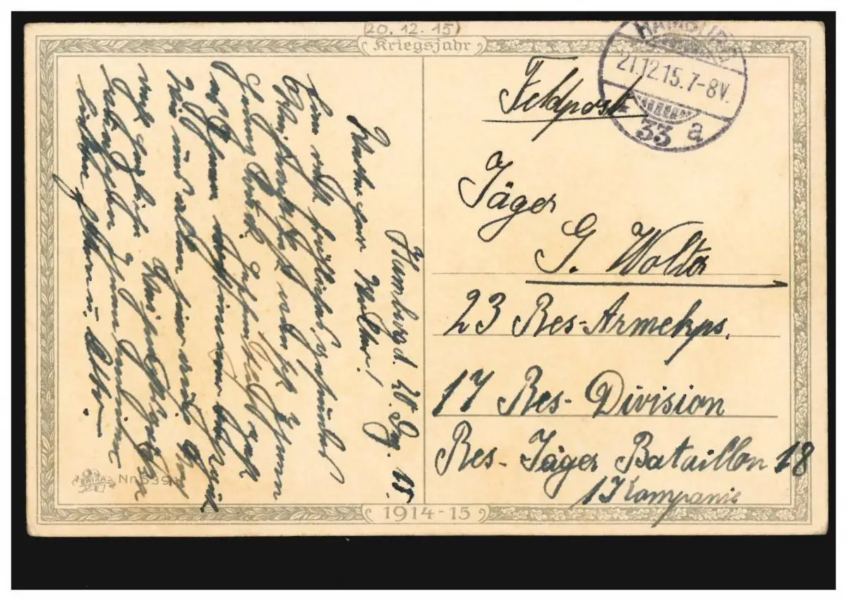 AK de Noël Sagittaire Reich, poste de terrain HAMBURG 33a 21.12.15 à la batellerie Res.-Chemin 18