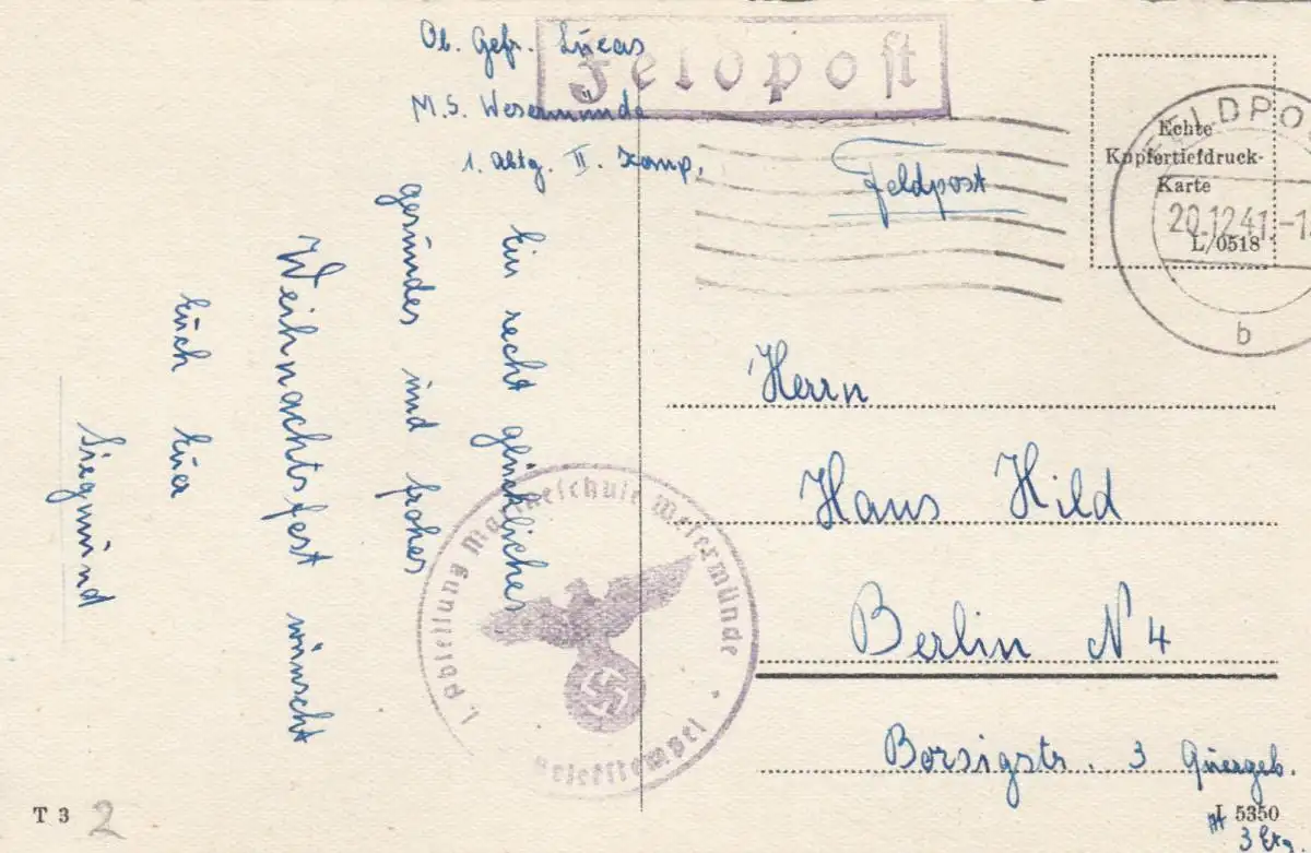 Carte de Noël Feldpost 1941 M.S. Wesermünde Marineschule à Berlin