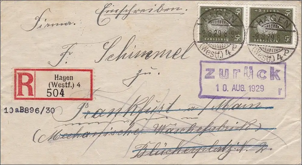 Weimar: Lettre de Hagen à Francfort et retour en recommandé