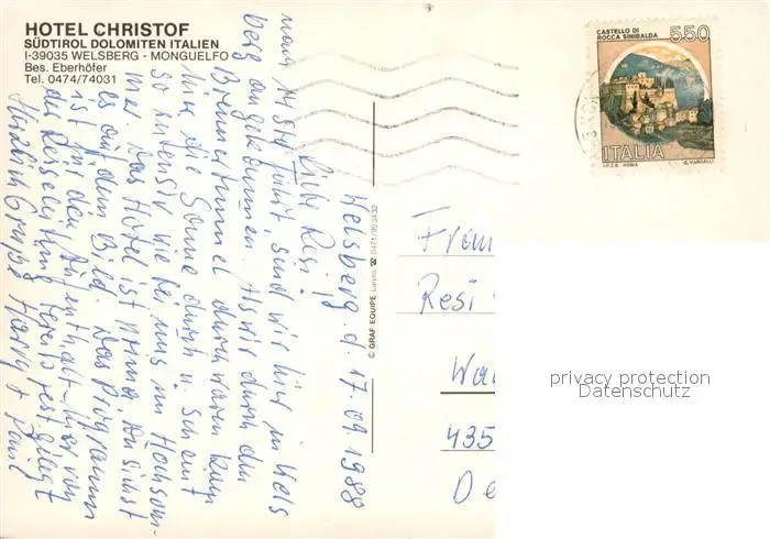 Welsberg Hotel Christof Hallenbad Welsberg postalisch gelaufen 1988 Erhaltung siehe scans [WerneD78] WernPID7