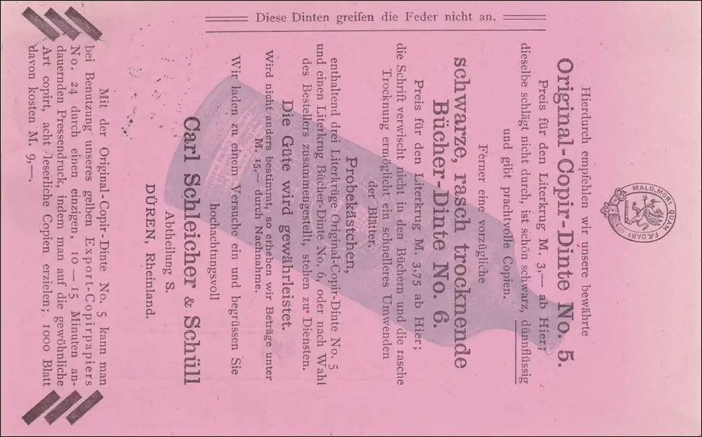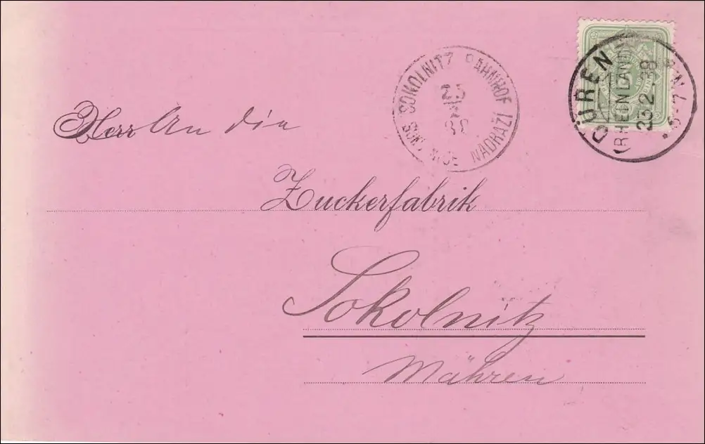 Carte publicitaire Düren vers Moravie à l'usine sucrière avec publicité pour l 'encre de livre 1888