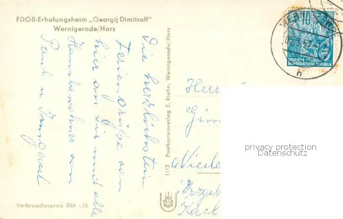 Wernigerode_Harz FDGB Erholungsheim Georgij Dimitroff Wernigerode Harz postalisch gelaufen 1957 Erhaltung siehe scans [WerneD78] WernPID7