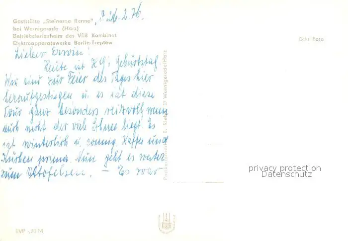 Wernigerode_Harz Gaststaette Steinerne Renne Betriebsferienheim im Winter Wernigerode Harz postalisch nicht gelaufen 1976 Erhaltung siehe scans [FriedD77] Frierer